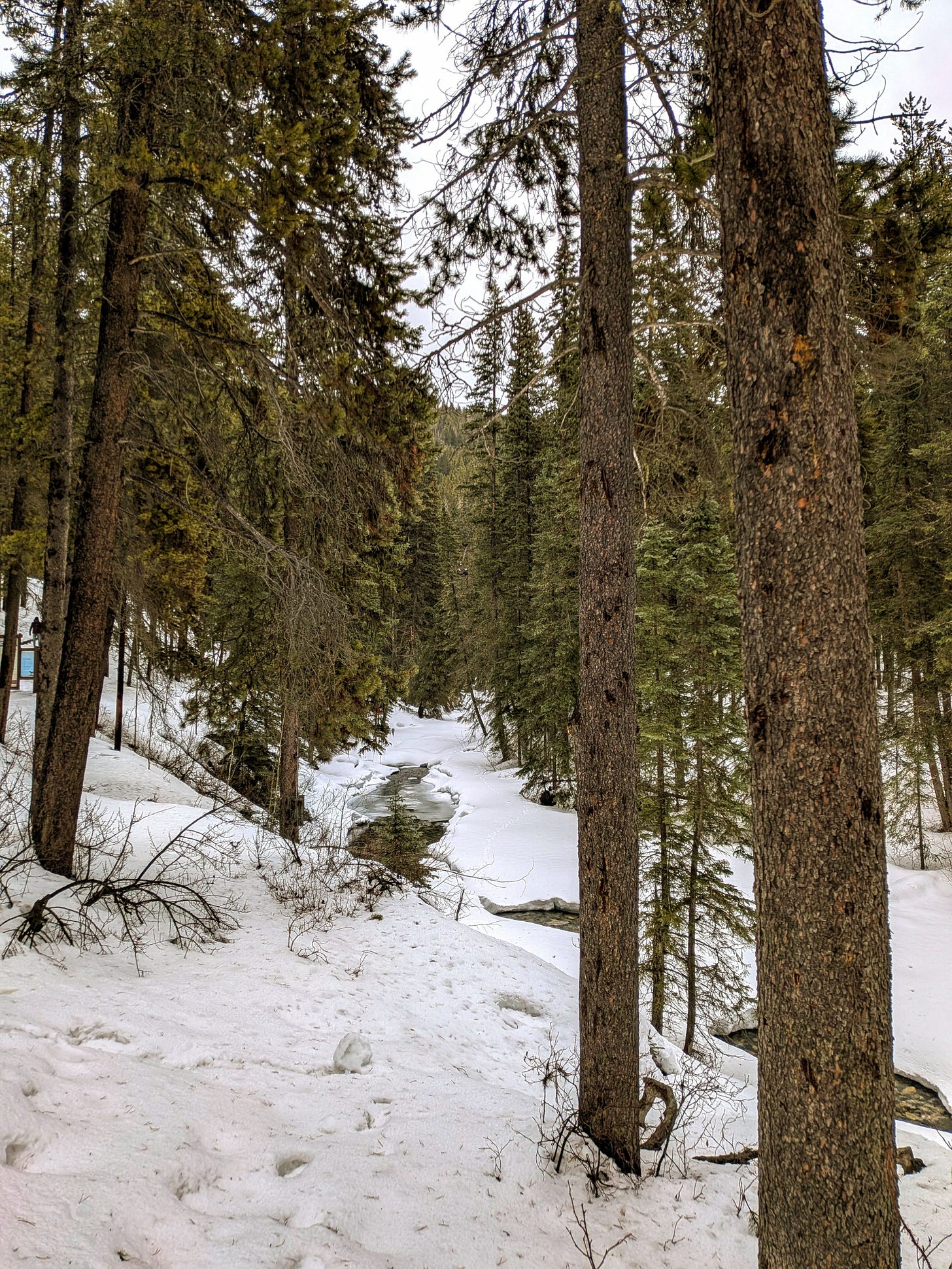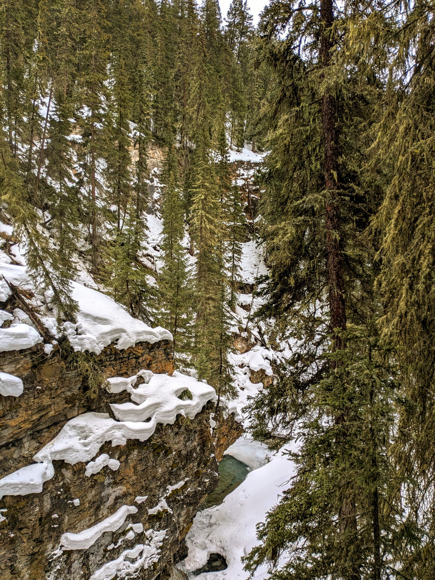 This Johnston Canyon trail is notorious for being very icy well into spring, and you’re best served if you come prepared with gear like crampons and poles. Well, we didn’t have any of that. The goal was mainly to see how far in we could go.